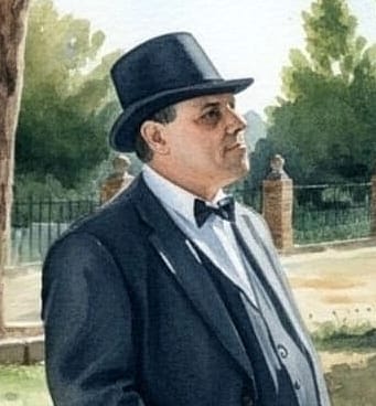 Representando al Sr. D. Antonio Puig Campillo, polifacético intelectual, escritor, historiador, periodista y pedagogo, miembro de la Real Academia de la Historia, Cruz del Mérito Naval con distintivo blanco, Caballero de la Orden civil de Alfonso XII, miembro de la Real Academia de Bellas Artes de San Telmo, de la de la Real Academia de Buenas Letras de Barcelona, de la Real Academia de Ciencias, Bellas Letras y Nobles Artes de Córdoba y de la Real Academia Hispano Americana de Ciencias, Artes y Letras.