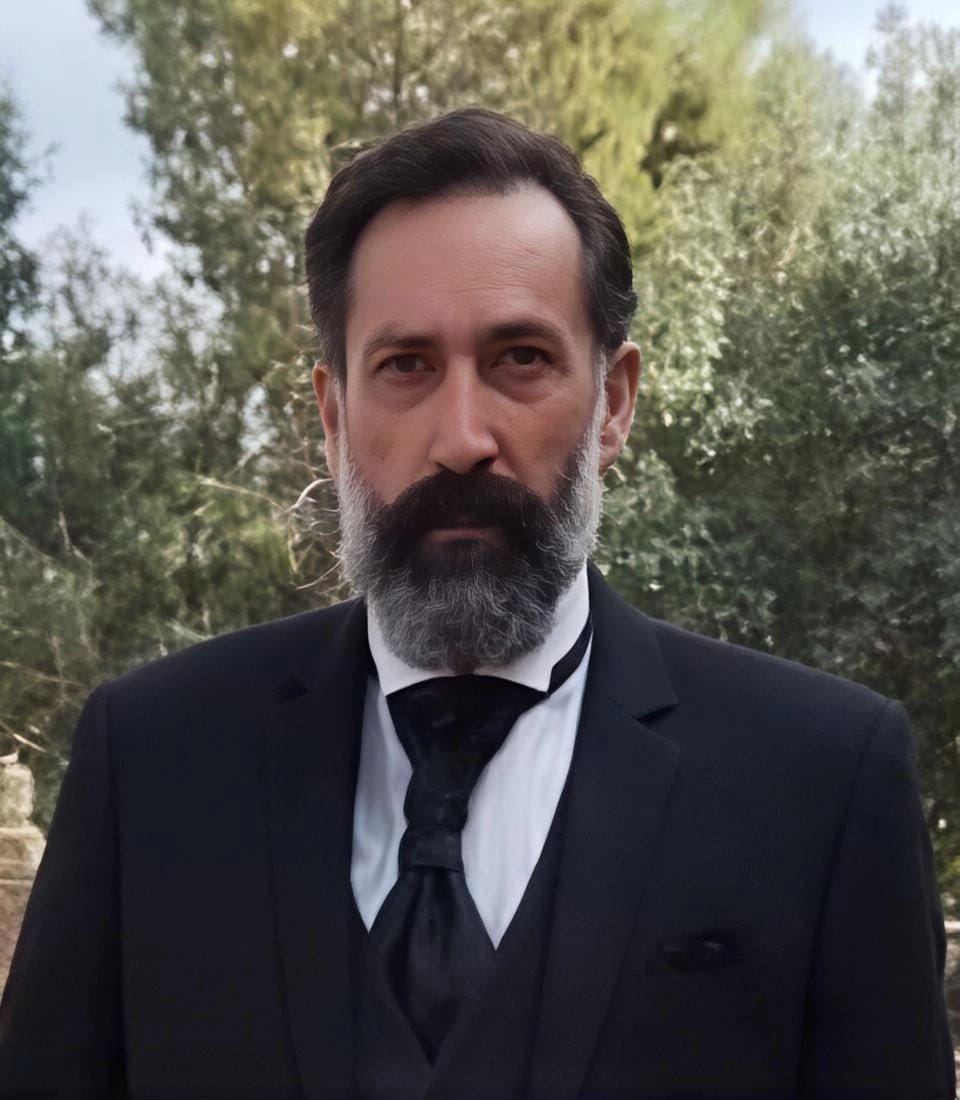 Representando al Dr. D. Miguel Leonardo Méndez Zamora, Inspector de farmacia y propietario de la farmacia Bonmatí en Mazarrón, hijo del Sr. D. Ginés Eulogio Antonio Méndez Zamora García y Jorquera, tendero, boticario, recaudador de impuestos de consumo y presidente de la lógia masónica de la Casa del Pósito del Pescador en el Puerto de Mazarrón hacia 1885 y de la Sra. Dña. Lucia Paula Antonia Josefa de Zamora Campillo Hernández y de Paredes, ambos de la noble Casa de Zamora, de ascendencia real, descendientes de personajes tan ilustres como el príncipe de Melfi D. Andrea Doria o del Papa Inocencio VIII entre otros, y que al casarse con la Sra. Dña. María de los Dolores Bonmatí Gómez, tedría como hijo al famoso alcalde de Mazarrón D. Antonio Méndez Bonmatí.